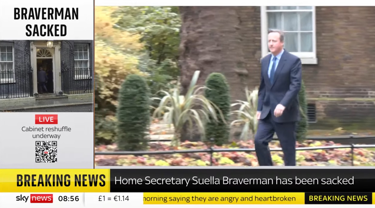 首相府於當地時間周一上午8時30分公佈柏斐文離職,隨後陸續公佈內閣重組細節,內政大臣由原任外相祁湛明(James Cleverly)調任,外相一職由已離開國會6年的卡梅倫(David Cameron)「出山」擔任。另一方面,與前首相卓慧思友好的環境大臣高翠玲(Thérèse Coffey)亦離職,由衞生大臣柏建熙(Steve Barclay)接任。
