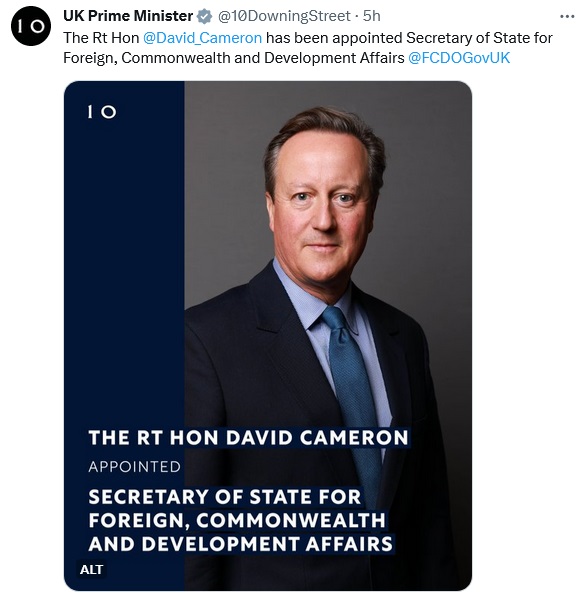 卡梅倫獲委任後發聲明,稱英國面對不同挑戰,包括烏克蘭的戰爭和中東危機,英國需在世界急劇轉變的時間加強與盟國的關係,但沒有提及中國或俄羅斯。
