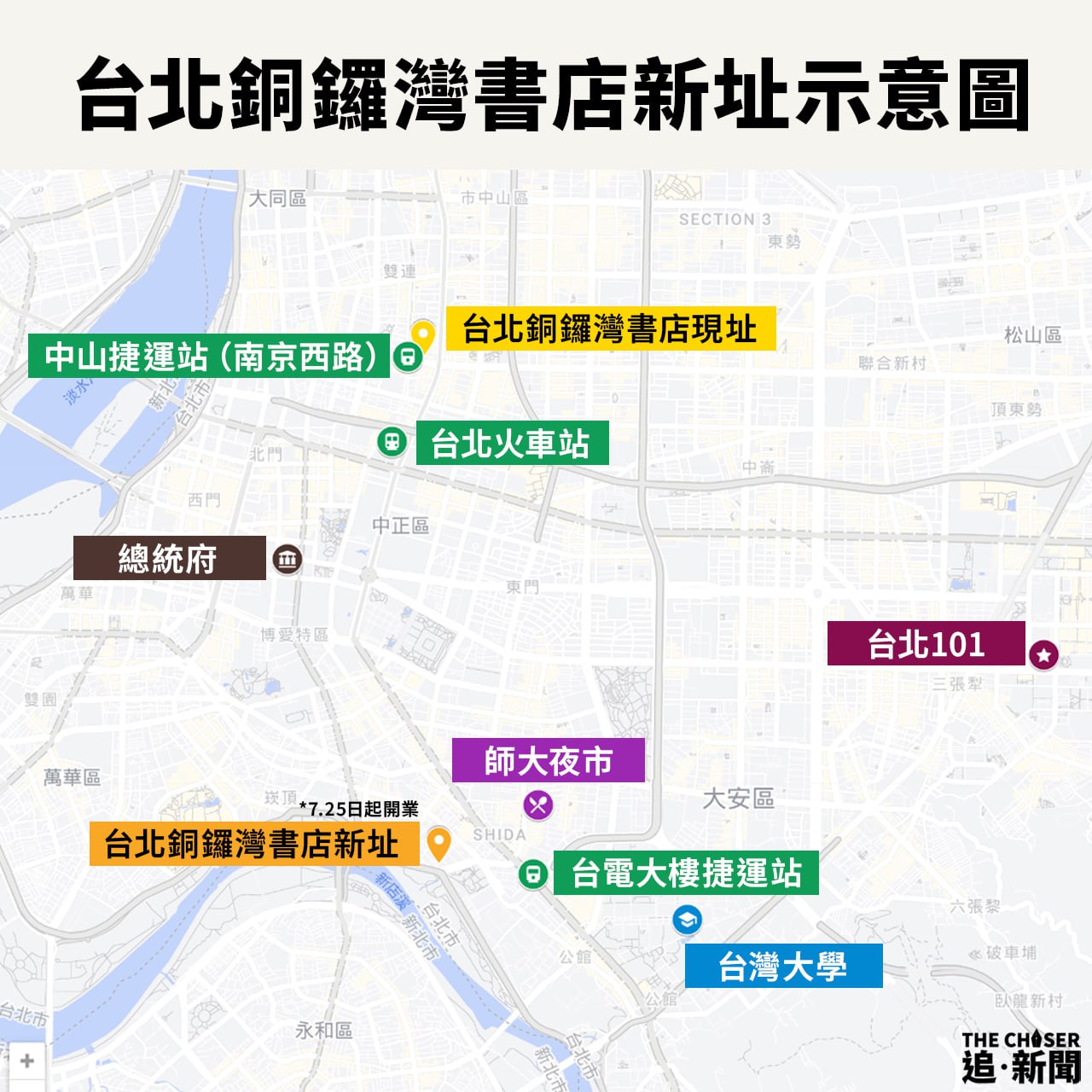 台北銅鑼灣書店新址位於台北古亭金門街35號(見上圖),毗鄰台電大樓捷運站,附近有台灣大學、台灣師範大學等大學校區,也靠近人稱台北舊書街的牯嶺街。林榮基發給《追新聞》新址照片顯示,和台北銅鑼灣書店現址樓上舖不同,新址是街舖,晚上6、7時,燈火通明;面積大約400呎,是中山店現址的2/3;租金亦較現址便宜1/3。他和中山店業主的租約將於下月20日屆滿,而他在古亭新址租約則為期2年。林榮基表示,書店暫訂7.25改在古亭新址開業。