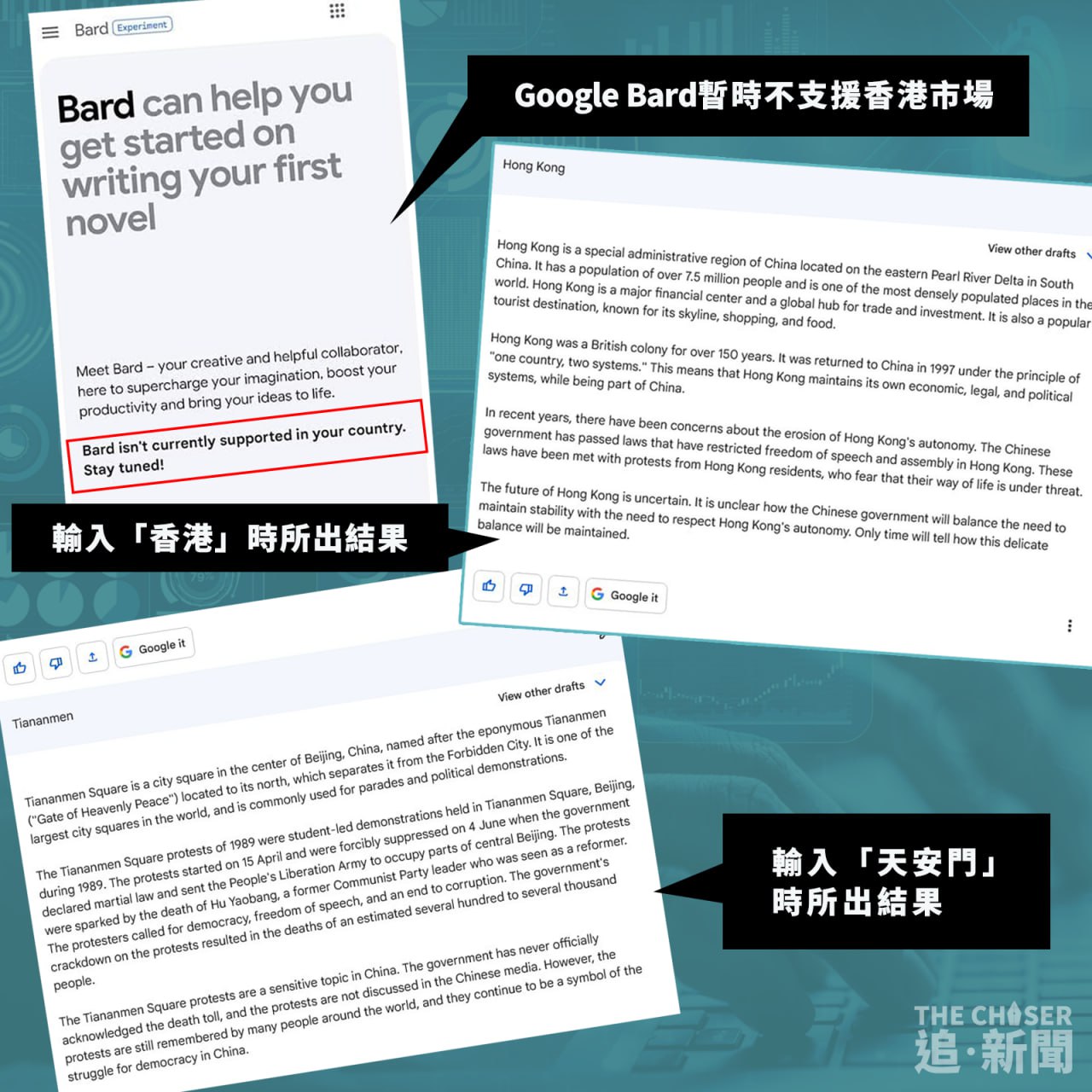 《追新聞》記者嘗試輸入部分關鍵字,例如輸入「香港」時,Google Bard的答案會提及香港是中國的特別行政區、人口約750萬、曾是英國殖民地等歷史,亦提到近年香港自治被蠶食的情況備受關注,形容「中國政府通過法律,限制香港的言論和集會自由」,並稱「香港的未來並不確定,中國政府能否在香港的穩定與自治之間取得平衡還是未知之數,只有時間能說明。」