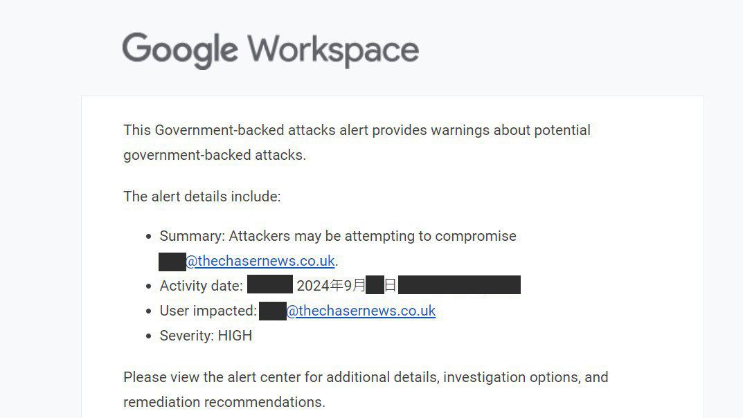 《追新聞》日前收到Google通知,偵測到《追新聞》的公司電郵帳戶遭到「國家級黑客」(Government-backed attacks)試圖入侵。Google稱該公司在全球只有0.1%用戶遭到類似攻擊,雖然不排除有關警告可能只是虛驚一場,但強調是因為偵測到可疑活動,才確信有國家級黑客發動攻擊,試圖竊取《追新聞》的密碼或用戶個人資訊。