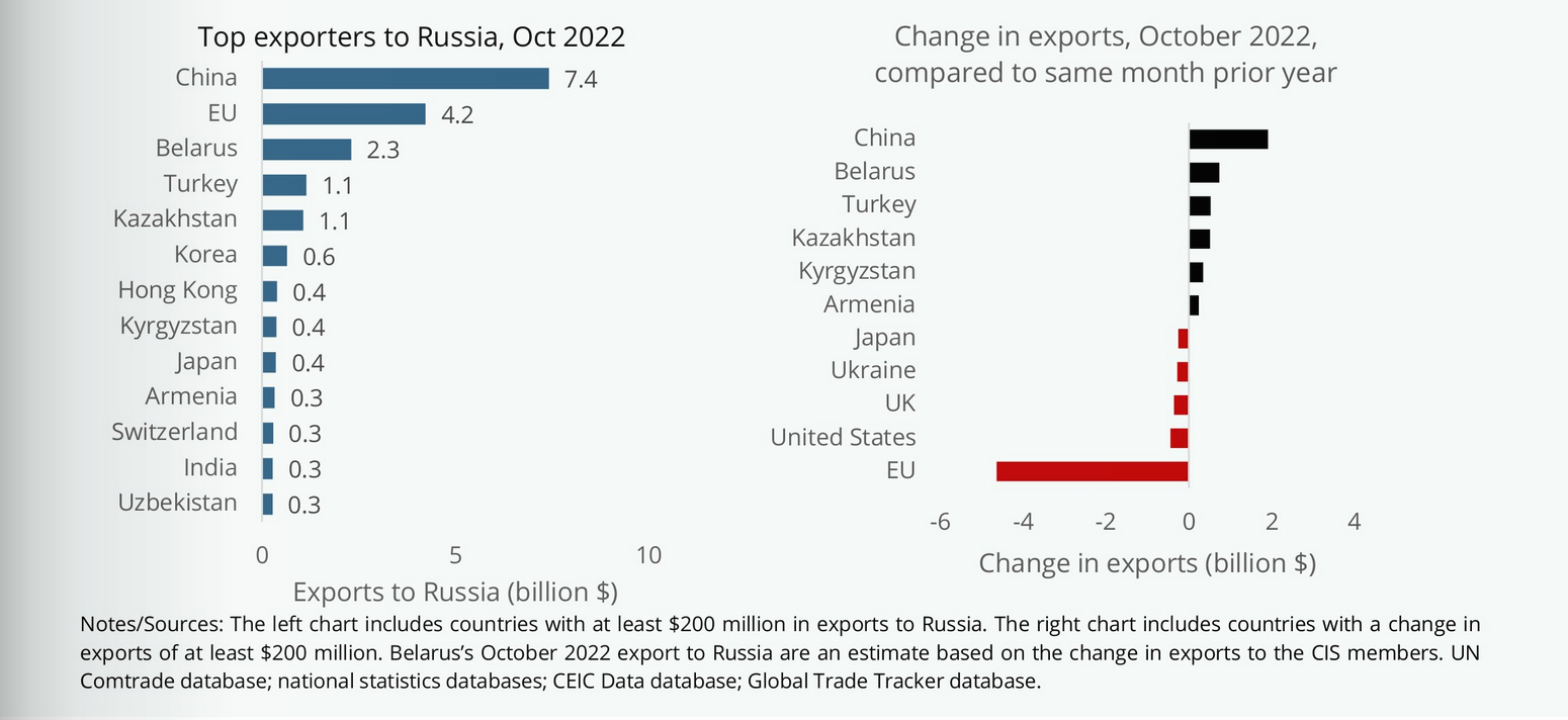 俄羅斯亞洲工業家與企業家聯合會主席維塔利·曼克維奇對俄羅斯官方衛星通訊社明言,香港仍然對俄羅斯開放,可以平行進口撤出俄羅斯的西方公司的產品屬一大優勢。政府統計處的數字可見,開戰前平均每月有900多萬港元的鐘錶出口往俄國,開戰及禁運後大跌八成,但之後慢慢恢復,到去年1月升至有紀錄以來第二高,近2,800萬。