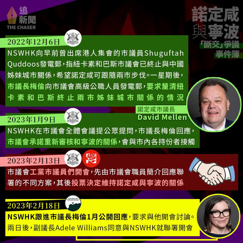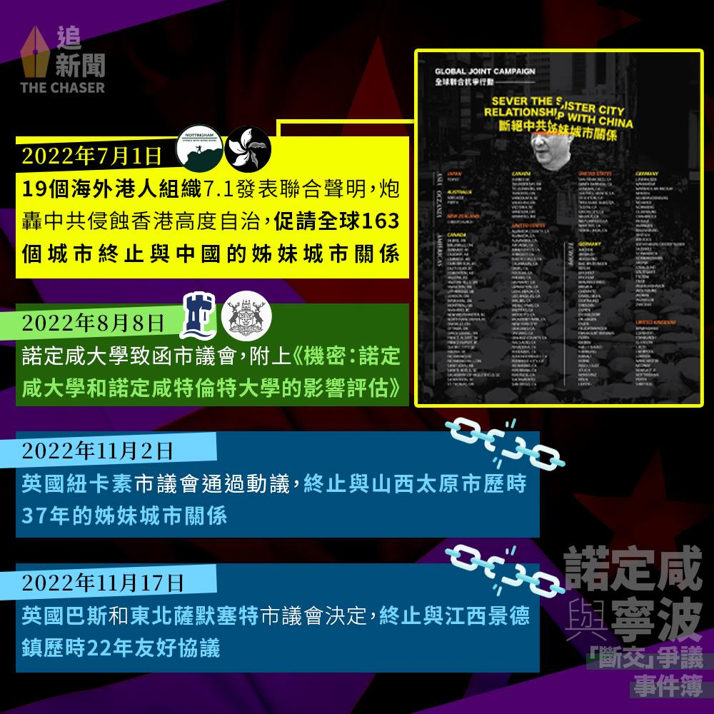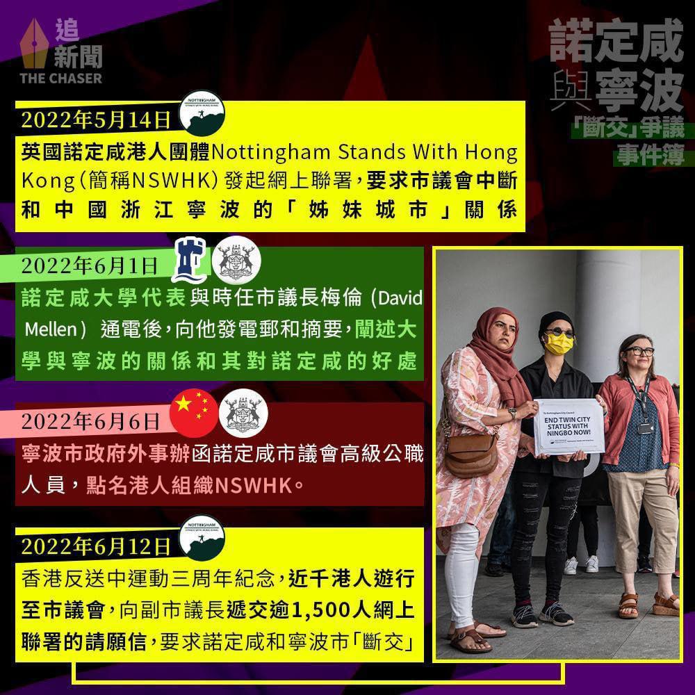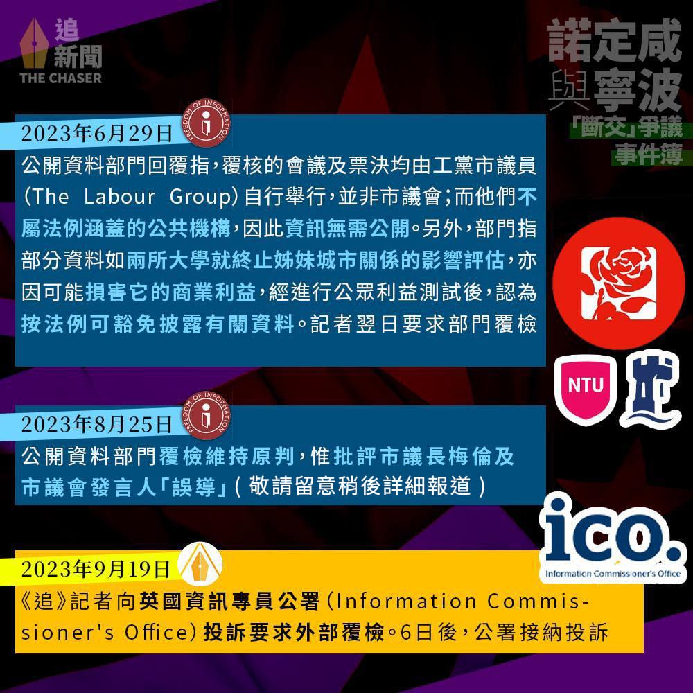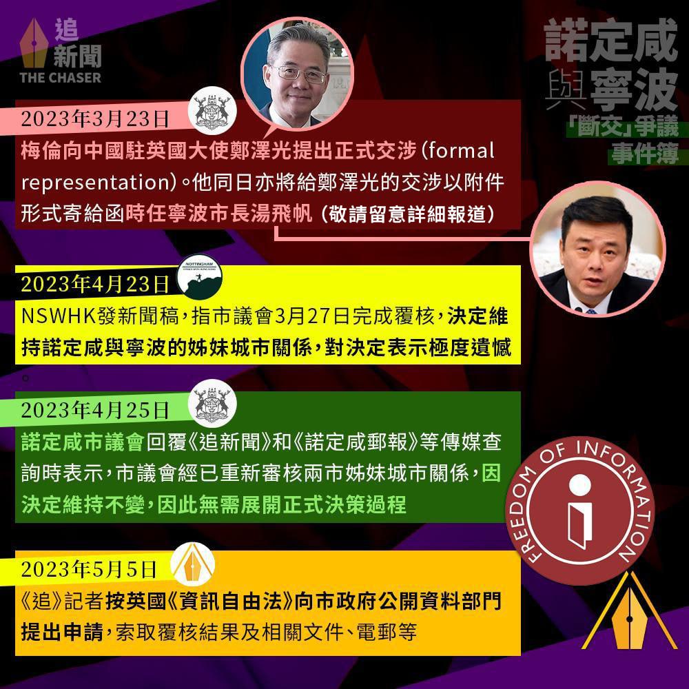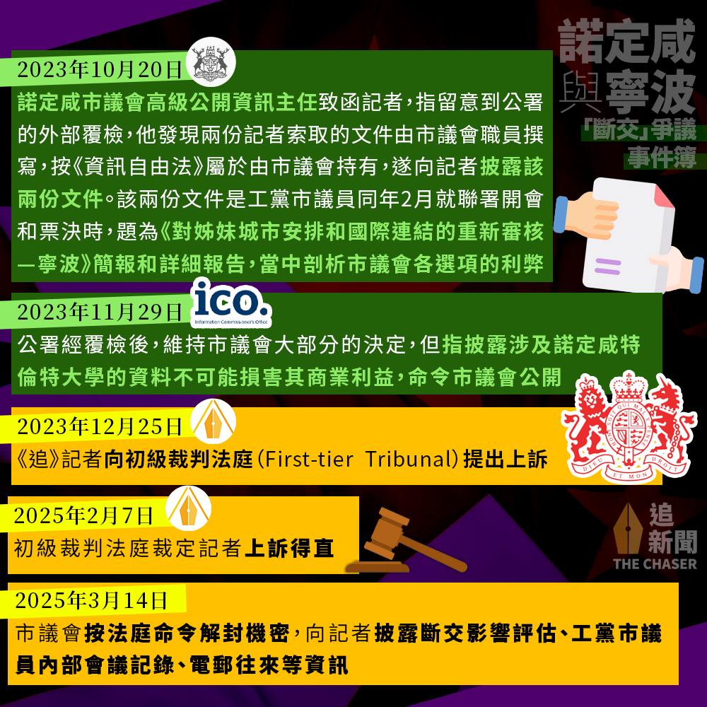 英國諾定咸市政府(又稱市議會)和資訊專員公署早前被法庭裁定敗訴,須按《資訊自由法》向《追新聞》記者公開有關諾定咸與寧波姊妹城市關係等「機密」文件。市政府周五(14日)按法庭命令,於死線前向記者披露兩市中斷關係的影響評估、工黨市議員內部會議記錄、電郵往來等資訊。稍後有詳細報道。