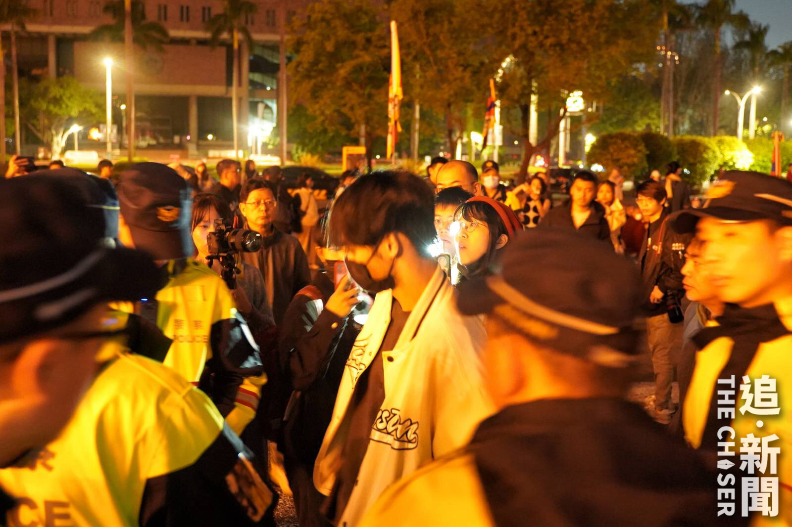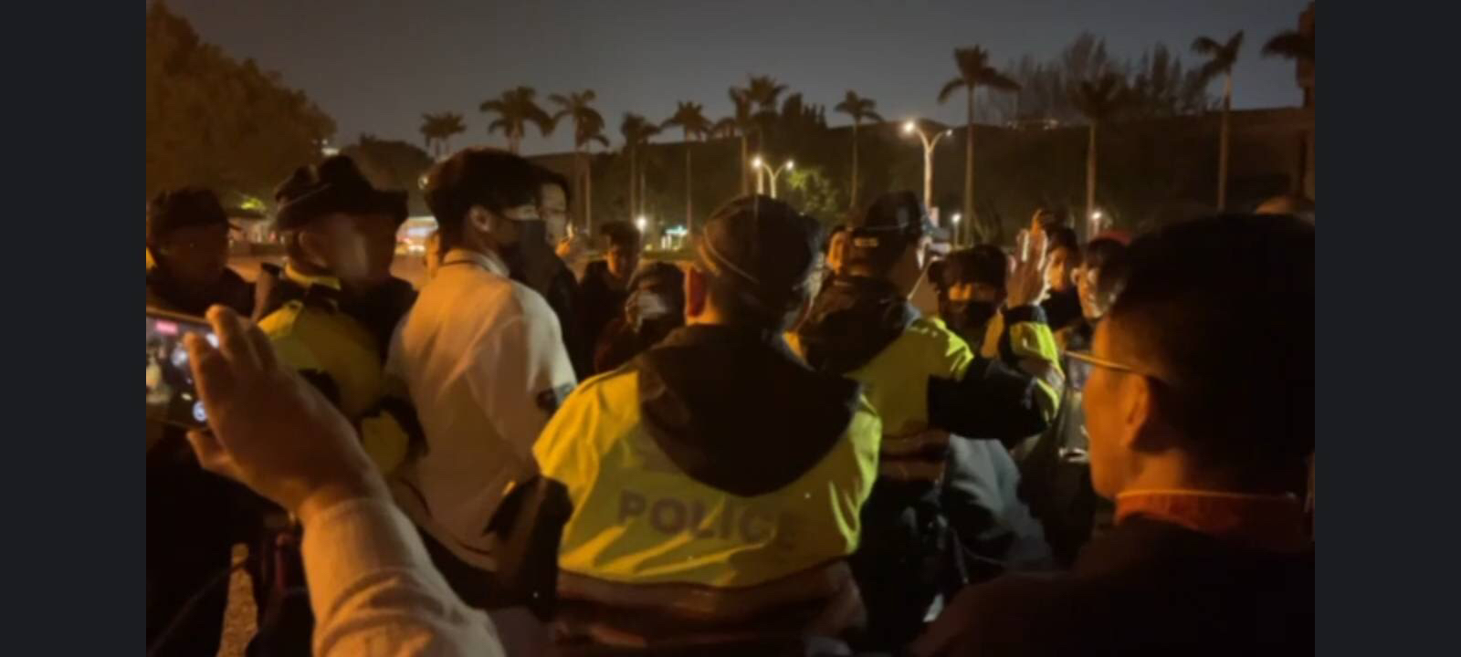 - 現場人士指白衫男故意鬧事,白衫男反駁,雙方爆發口角,數名台警立即拉走白衫男,要求對方保持冷靜,不要激動;另一台警則要求人群後退。 現場影片截圖
