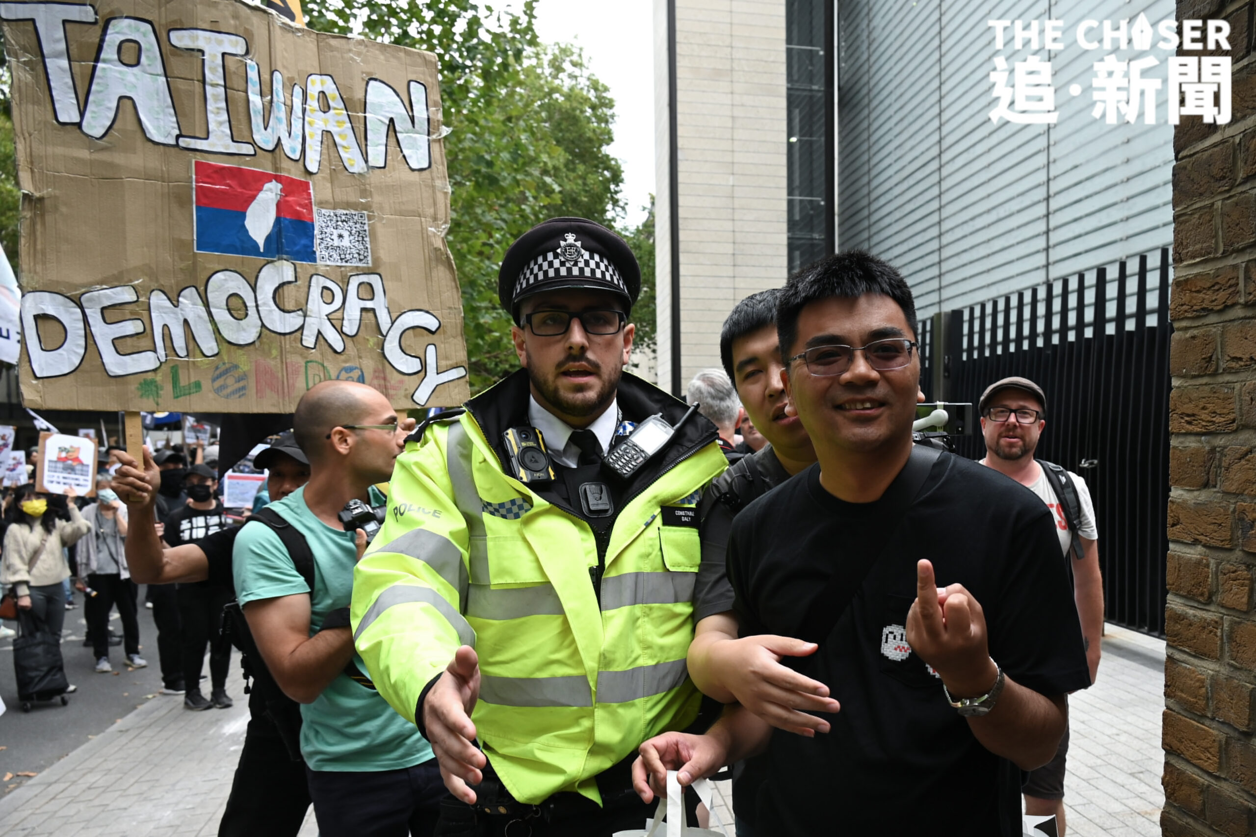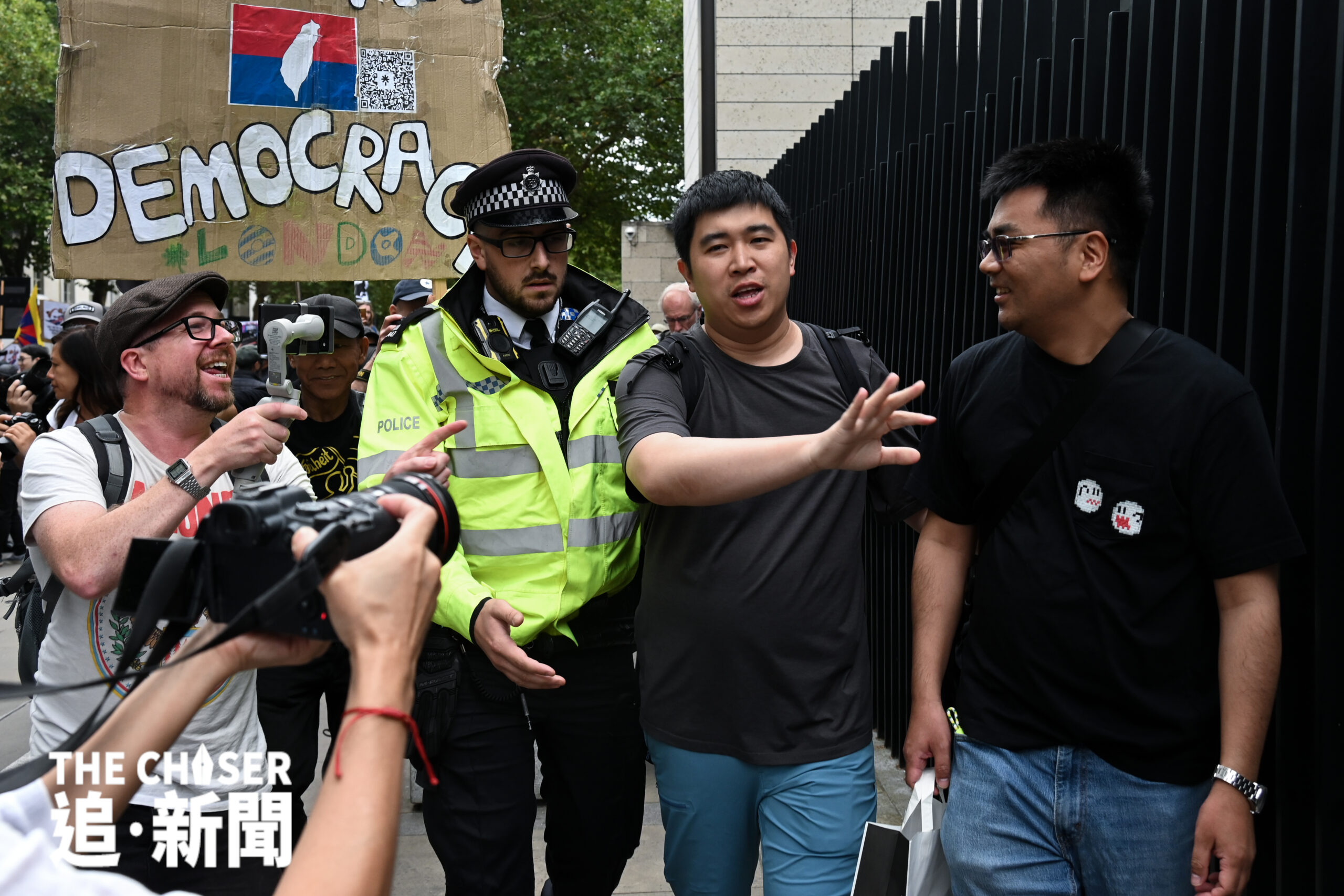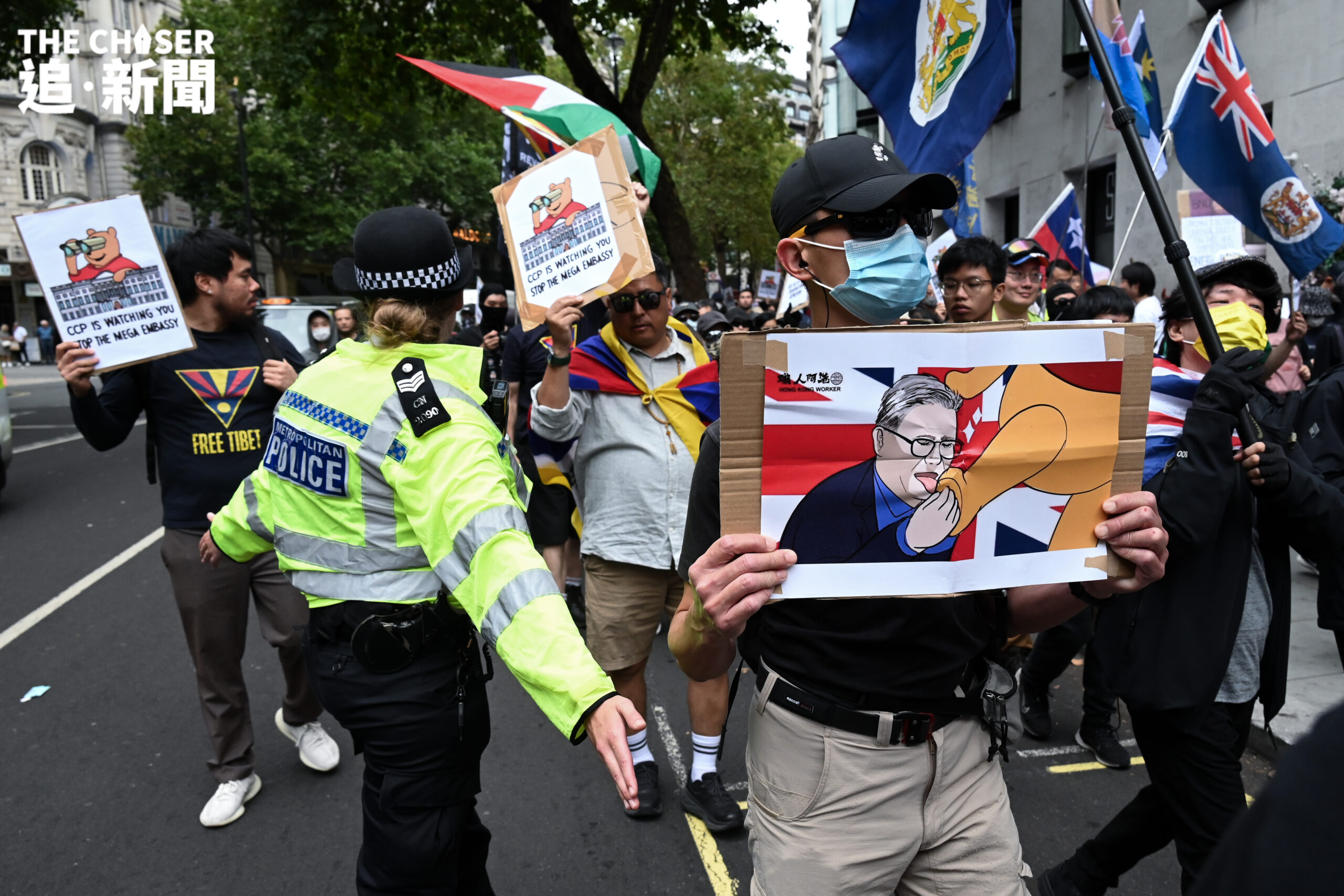 遊行約於下午兩時半前後開始,甫起步就有一名華裔男子在大英博物館對開出言及豎起中指挑釁,一名撐拐杖的示威者一度趨前試圖反擊時被大會義工制止,警員亦隨即介入,將該男與其同行男子帶離現場,期間被其他示威者及一名反中共 YouTuber 尾隨指罵,該名男子繼續帶笑向示威者及記者舉中指,但就連同行男子亦不禁輕聲叫他「別鬧了」。
