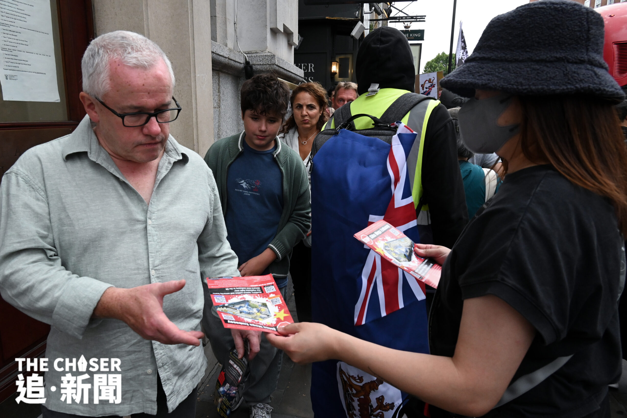 剛獲英國政府批出難民身份的香港獨立倡議委員會創辦人鍾翰林發言時則坦言英國政府在中國拒絕解釋使館設計圖被塗黑的部分後,選擇延遲作最終決定令人灰心。縱然每次發聲爭取訴求未必都有「好結果」,但要對在英國享有的集會、結社自由「珍而重之」。