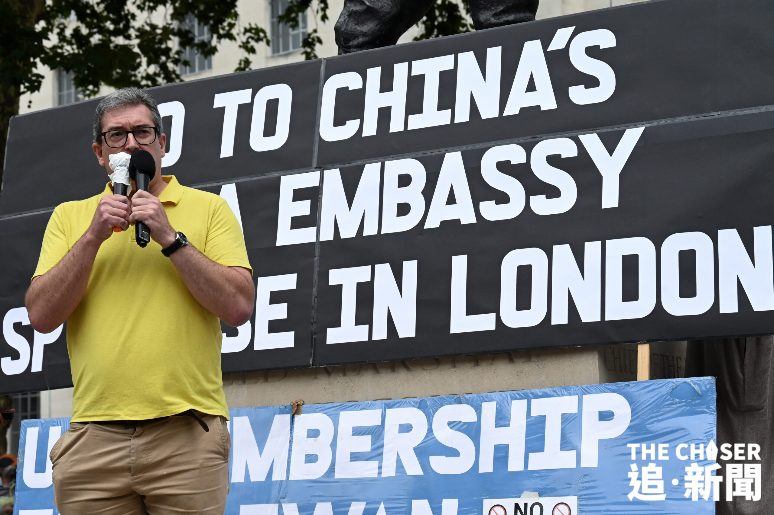 ▲ 香港監察聯合創辦人羅傑斯曾於2月首次反「超級大使館」集會上發言,周六在遊行終點白廳發言時批評中方規劃會對在英香港、西藏、維吾爾以至烏克蘭族群帶來直接威脅,呼籲副首相韋雅蘭即時否決中方申請。(梁銘康攝)