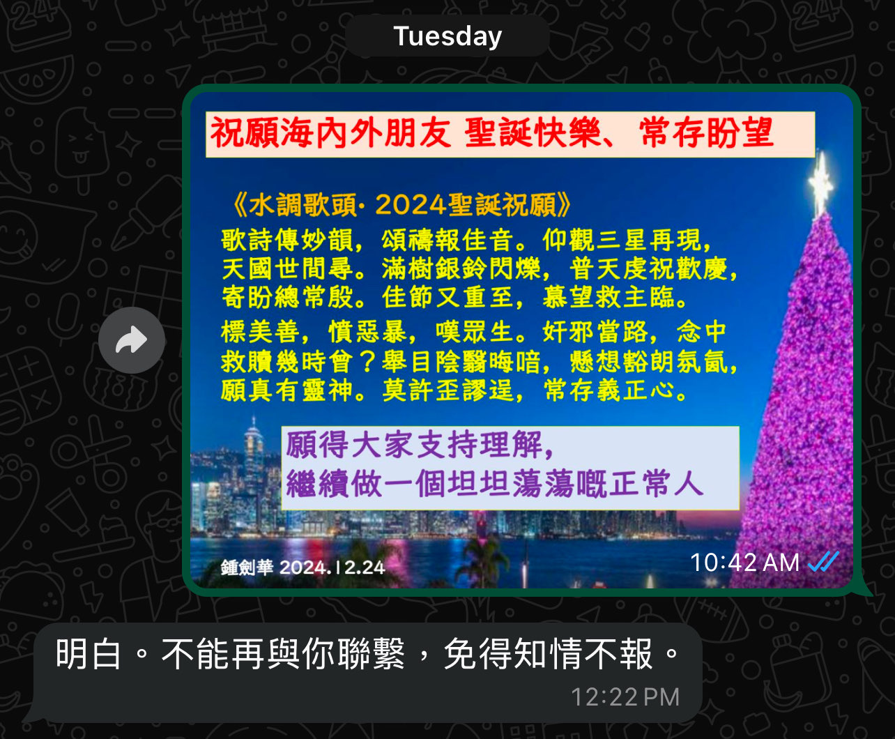 鍾劍華強調:「其實來英兩年多來,我跟這位朋友的聯繫就是這種形式,從來沒有談過我在英國的情況,沒有問過他在香港的情況。所以我都唔知佢擔心乜嘢『知情不報』。如果收到一個如此的問好訊息都是知情不報嘅話,這不正是在呼應暴權政府的行為,或者是滿足或配合這個暴權政府作為的助力嗎?」