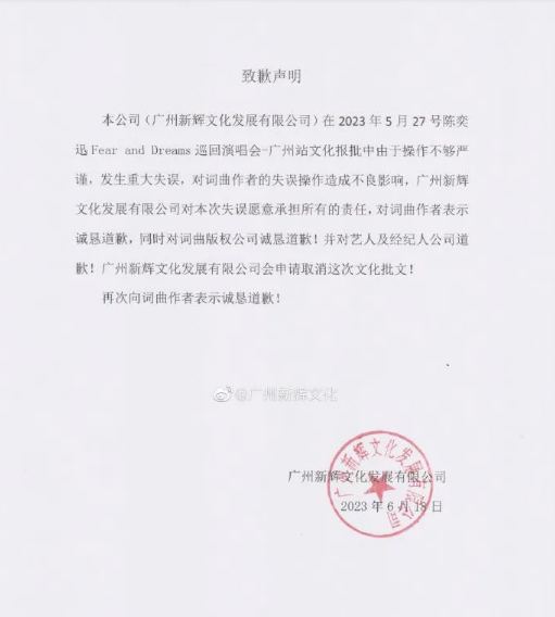 主辦單位廣州新輝文化發展有限公司周日(18日)在微博發出致歉聲明,全文隻字不提「林夕」,只承認5月底在「報批」陳奕迅演唱會時,由於操作不夠嚴謹,發生重大失誤,對詞曲作者的失誤操作造成不良影響。該公司對今次失誤願意承擔所有的責任,對詞曲作者表示誠懇道歉,並對詞曲版權公司道歉,已申請取消這次文化批文。