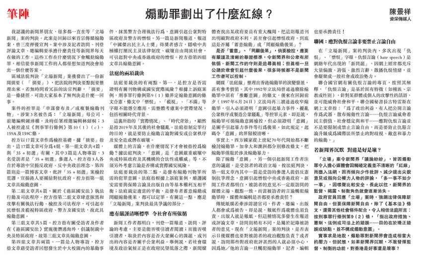 《信報》前執董及副社長陳景祥周三(4日)在《明報》發表題為〈煽動罪劃出了什麼紅線?〉一文,直指《立場》案令新聞界「議論紛紛」,皆因煽動罪令人擔心媒體會因觸碰定義並不清晰的「紅線」而墮入法網,因而傾向少作批評、減少提出尖銳意見或指向公權力人物的評論,長此以往,新聞界的監督、揭露、制衡角色就會逐漸消失。