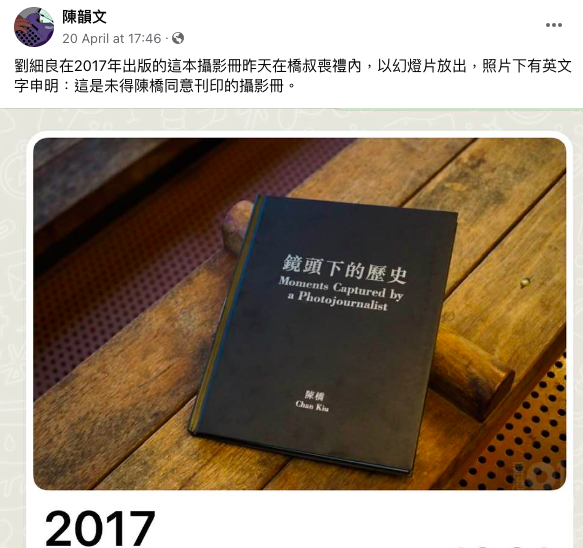 事件緣於4月20日,作家陳韻文在陳橋追思會後於Facebook發文透露,陳橋的攝影集《鏡頭下的歷史》曾出過兩版,2017年由「上書房」推出的精裝版並未獲授權,在追思會上還特別提及劉細良出版的2017年版「是未經陳橋同意印刷的攝影冊」。