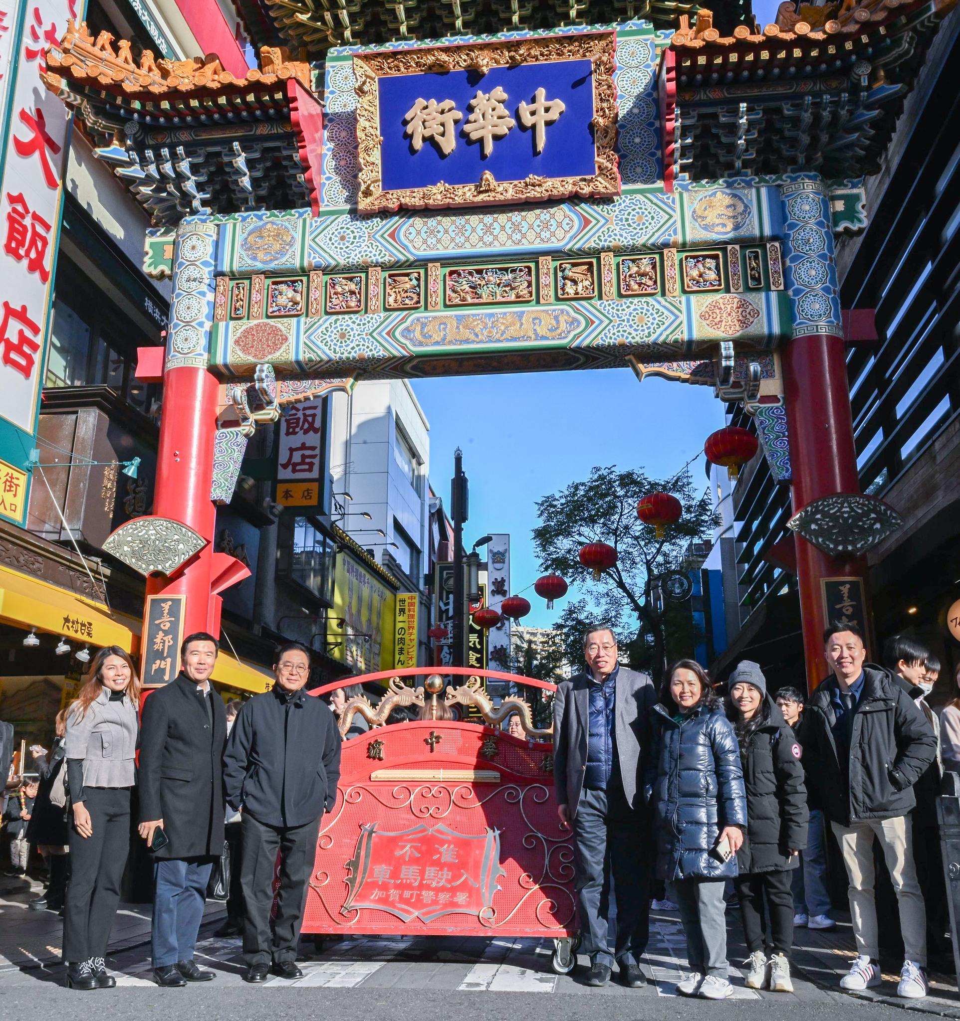 - ▲ 香港立法會議員視察日本,在食店林立的中華街牌坊下留影。