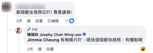 正當網民留言質疑:「都唔駛坐商務位吖!尊貴議員!」陳穎欣反駁:「有無睇片吖,唔係個個都係商務,有機制㗎。」該網民追問:「議員機制有嚴重問題,咪改囉,代表基層選民不能尊貴是必需的!咪淨係識批評政府,永遠睇唔到議會入面幾多問題,應該要審計署審一審,議會如何行(衡)工量值!」陳沒有再回應。這則對話令Facebook專頁《追蹤黨媒》感到意外:「 小編因而晴天霹靂發現,原來陳穎欣的支持者以為陳穎欣係反對派同淨係識批評政府?!」