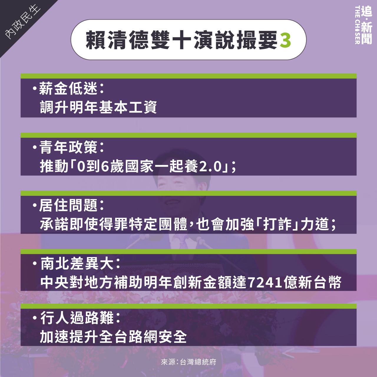 賴清德全長20分鐘的「雙十」演說,題為《團結台灣,共圓夢想》,當中提及台灣27次、台灣人民13次、中華民國8次及中華民國台灣2次。他除了重申5.20就職演說,中華民國、台灣、中華民國台灣可為國號、中華民國和中華人民共和國互不隸屬外,他並強調中華人民共和國無權代表台灣,指中華民國曾經在國際社會被驅逐,台灣人民從未自我放逐,台灣人民要向全世界開枝散葉。