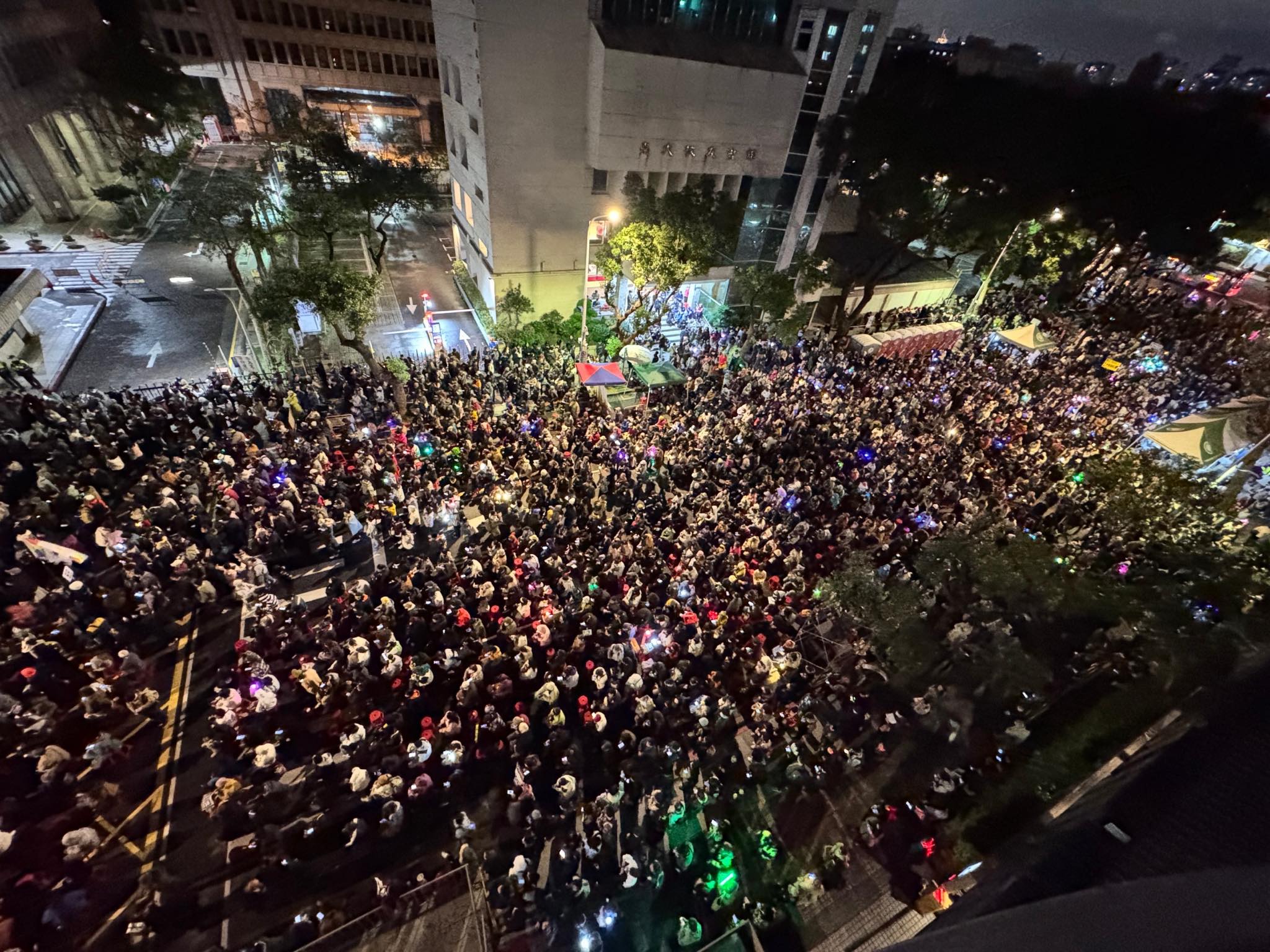 在立法院外,大批民眾由周四(19日)起已響應民間團體「青鳥行動」號召在立法院外聚集,主辦單位宣稱有萬人參加。周五接近中午時段,有示威者開始推倒鐵馬,一度試圖突破警方防線闖入立法院,並高喊「停止開會」,在場警員隨即築起人牆,與示威者互相推撞。曾被中共以「顛覆國家政權罪」關押5年的台灣人權工作者李明哲、近日揭露中共網絡統戰手段的網紅「八炯」均有到場聲援示威者。