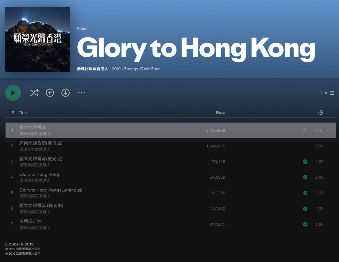 反送中運動歌曲《願榮光歸香港》的原曲創作團隊DGX MUSIC表示,歌曲在英國、美國及加拿大又再遭到發行公司封殺,「《願榮光》恐怕短期內會從各串流平台內完全消失」。《追新聞》記者發現《願榮光》原曲版本在Spotify、iTunes及KK Box均已被下架,目前只剩YouTube仍找到原曲版本。