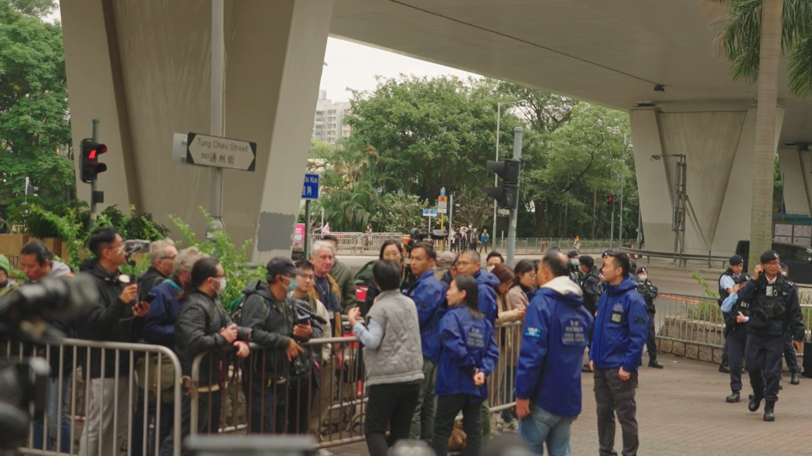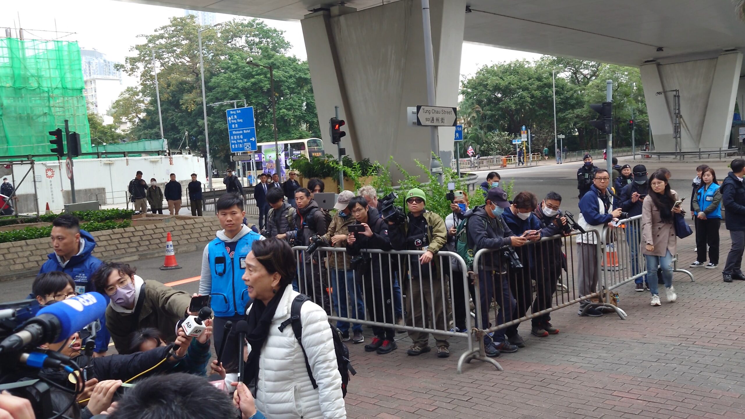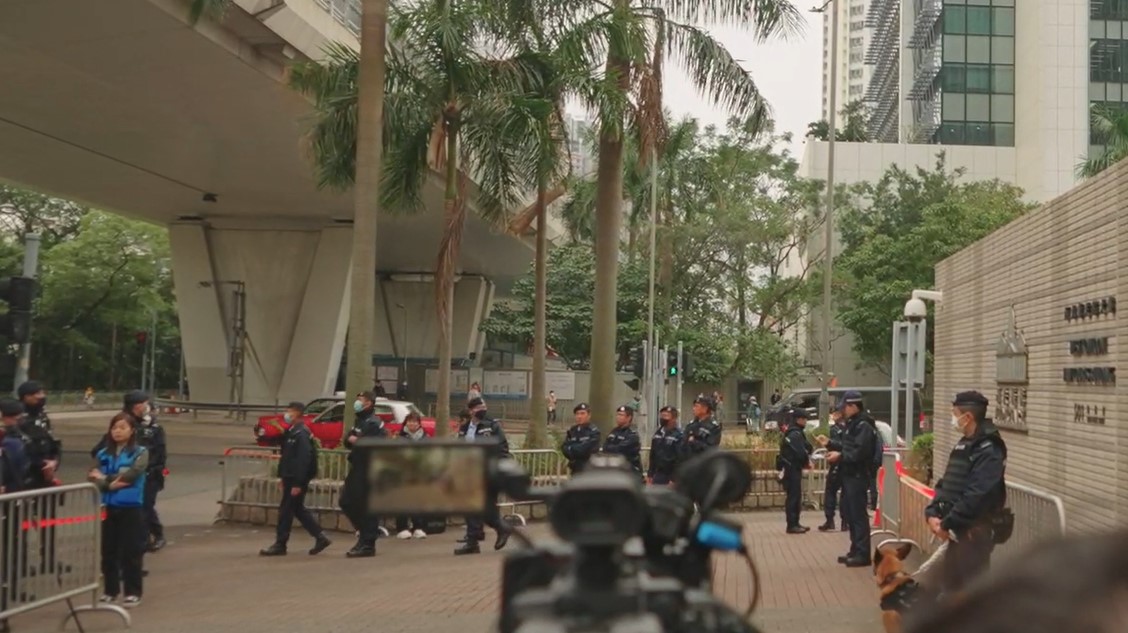 黎智英案受到國際關注,多間海外傳媒派人到場採訪,但所有記者都被警方限制在法院門外兩個由鐵馬圍起的「採訪區」內活動,數十名身穿藍色背心的警方「傳媒聯絡隊」成員在場監視,每當有人停下受訪,「傳媒聯絡隊」就第一時間上前「支援」,實則監聽受訪者的發言內容。