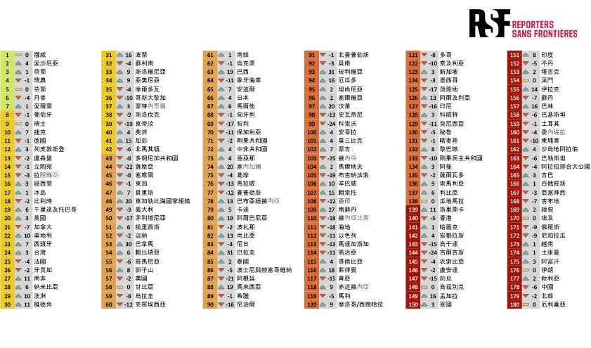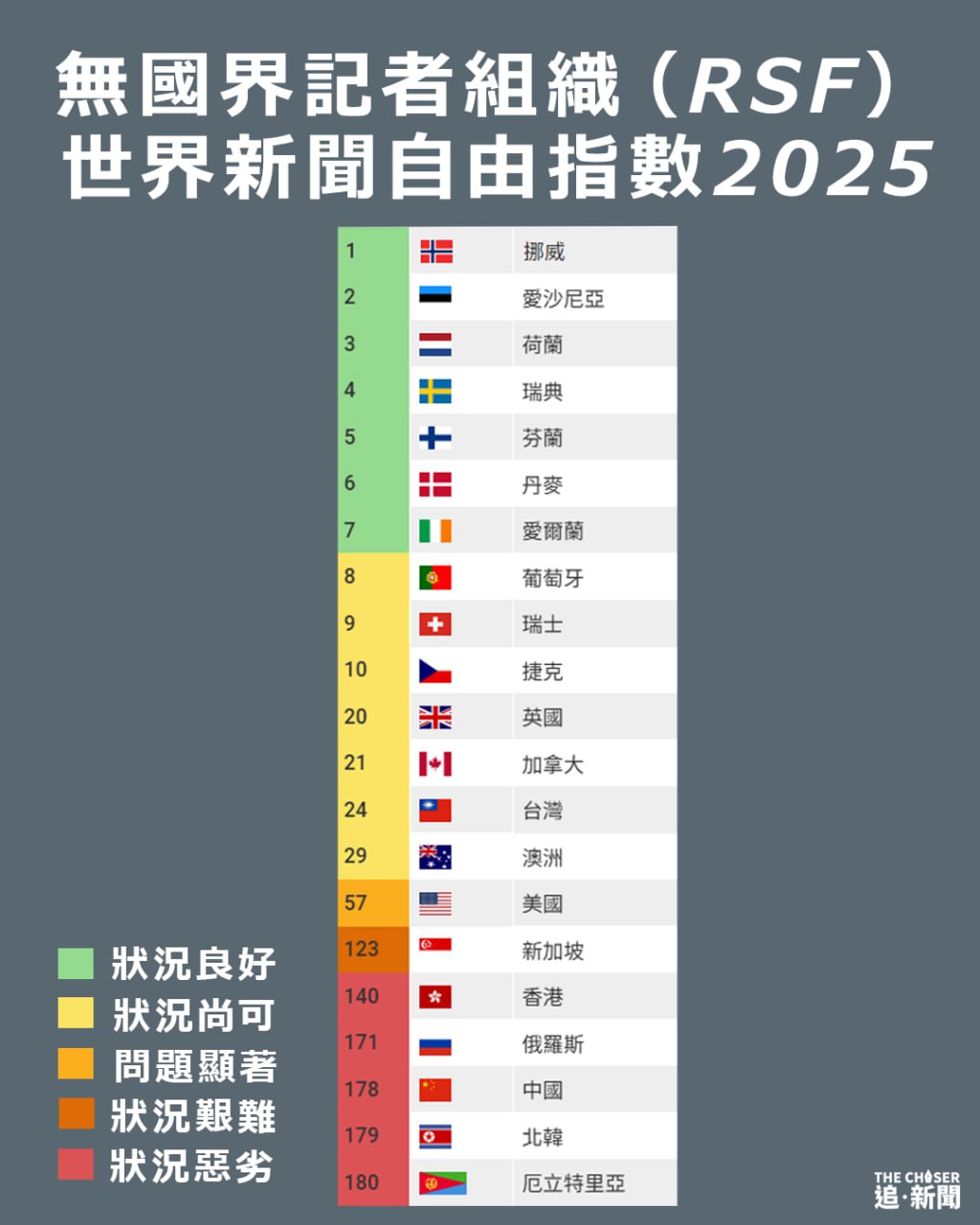 無國界記者組織(Reporters sans frontières, RSF周五(2日)公佈2025年度《世界新聞自由指數》,香港較去年下跌5位、排140名,首次跌入「狀況惡劣」紅色區域,與排名尾3的中國(178)、北韓(179)、厄立特里亞(180)看齊。報告指,香港對新聞自由的打壓,導致新聞編採部關閉、記者流亡,而親政府媒體則吸收大部份的媒體資助。在中國,媒體如非國家所有,便是與該國共產黨關係密切的團體控制,僅存的獨立記者大多在暗中活動、工作時常遭受威脅,且財務狀況不穩定,外國媒體更隨時可能被列入黑名單。