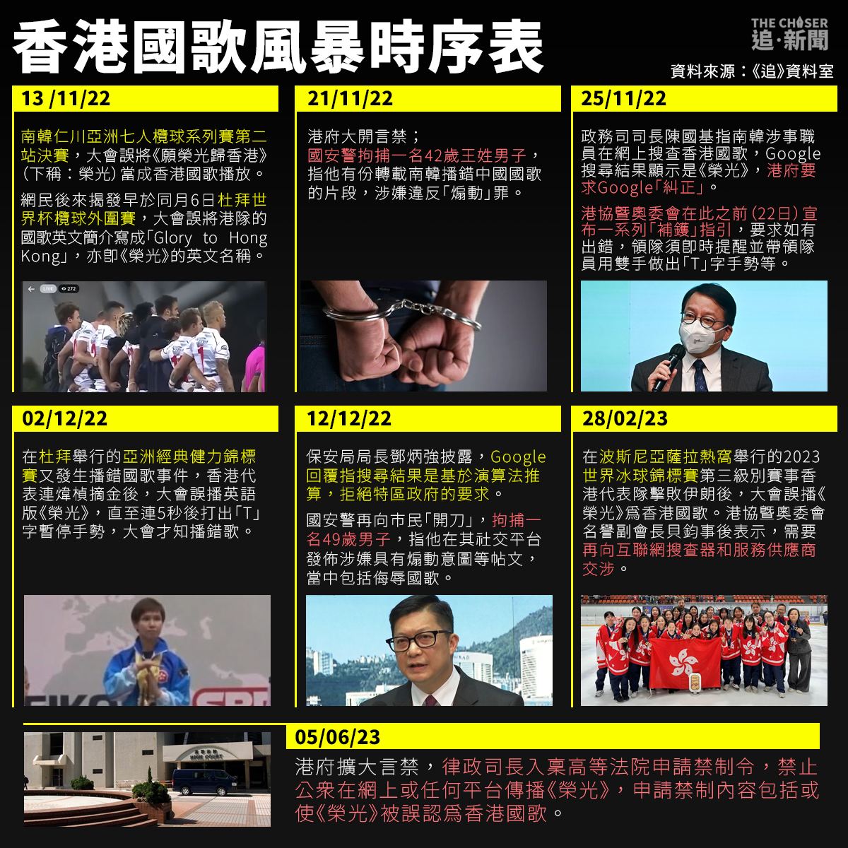 香港律政司入稟高院申請禁播2019年反送中運動歌曲《願榮光歸香港》,申請禁制內容包括或使《榮光》被誤認為香港國歌。香港國歌風暴始於去年11月南韓仁川舉行的亞洲七人欖球系列賽第二站決賽香港對南韓的賽事,大會誤將《榮光》當成香港國歌播放。香港代表隊之後在外參賽亦接連發生或被揭出現類似大會播錯國歌事件。
