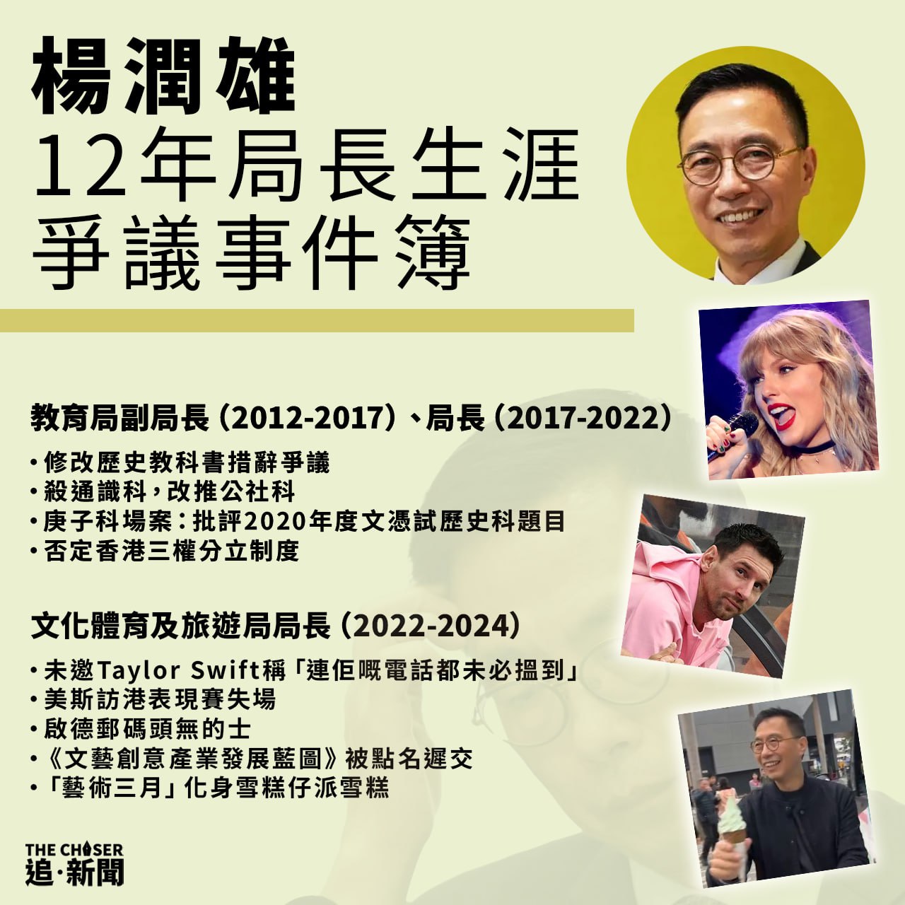 新華社周四(5日)報道,根據香港行政長官李家超建議,國務院任命羅淑佩為文化體育及旅遊局局長,免去楊潤雄的職位;另外國務院亦任命陳美寶為運輸及物流局局長,免去林世雄的職位。李家超在記者會上感謝林世雄及楊潤雄多年來努力工作,而陳美寶及羅淑佩則「賞識佢哋嘅領導能力、解說能力」。被問到是否代表被踢走的局長表現不佳時,李家超回應指是經過一段時期的觀察,並判斷未來時間希望做的工作而作出有關決定。楊潤雄在消息公佈後約1小時在Facebook發帖:「謝謝大家關心!天空海闊,踏上人生另一階段。」網民隨即轉發帖文並哼起Beyond名曲《海闊天空》:「今天我……」