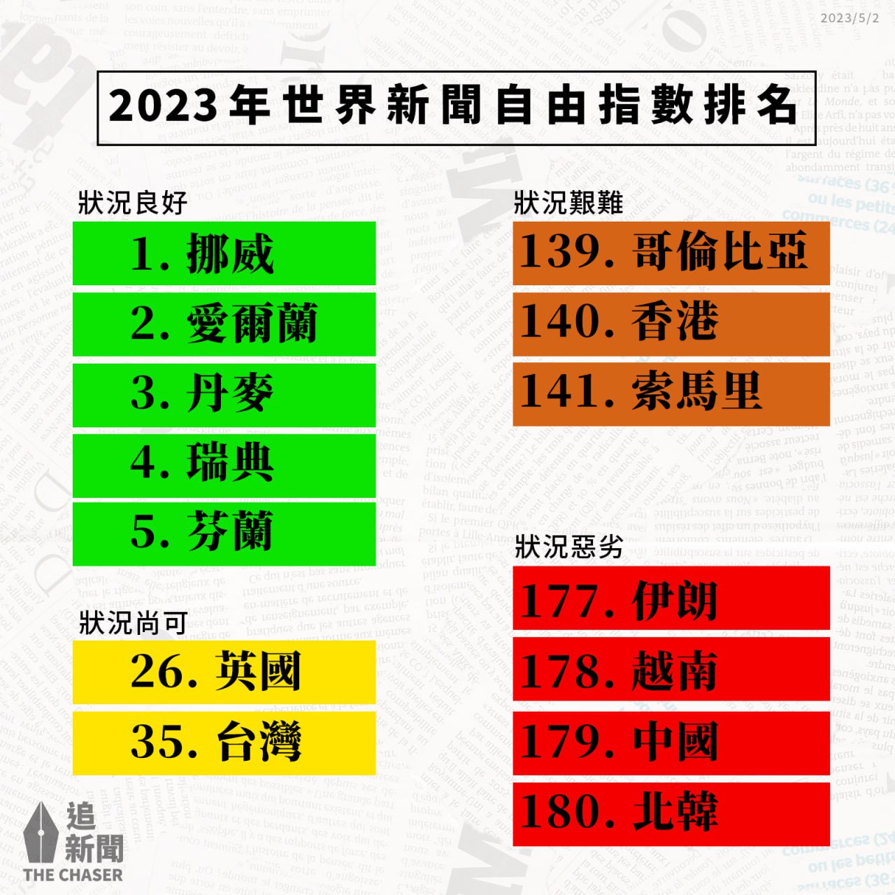 無國界記者(Reporters Sans Frontières, RSF)於周三(3日)「世界新聞自由日」,公佈「2023年世界自由指數」排名,評估180個國家和地區的新聞環境。《蘋果日報》、《立場新聞》高層被捕後,香港新聞自由自2021年的80位暴跌至去年148位,今年排名稍為回升至140位,但仍評為「狀況艱難」,與極權國家哥倫比亞、索馬里不相伯仲,還低於約束言論的新加坡(129位)。中國大陸由去年175位降至179位,排名倒數第二,報告指該國為「全球最大的記者監獄和宣傳內容輸出國之一」,現有100多名記者遭到監禁,「惡劣」狀況與伊朗、越南、北韓相若。