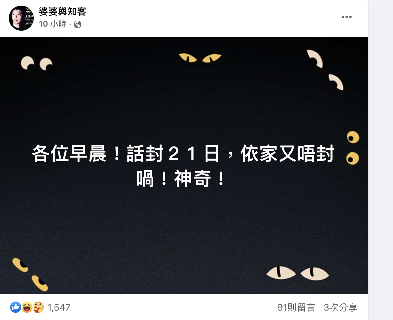 「各位早晨!話封21日,依家又唔封喎!神奇!」本來被通知被封21日的《婆婆與知客》周四(22日)又突然獲Fb提早解禁: 「試咪,試咪!婆婆試咪,XZYW!」支持者紛紛湧往留言支持:「 呢一局畀你贏,面書都驚婆婆」、「端午節快樂嘛!特『赦』呀!婆婆知客小濤食多兩隻糭嘞!」