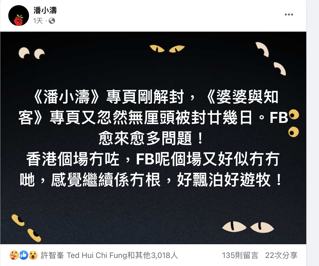 香港資深新聞工作者潘小濤在全球大型社交媒體Facebook專頁連環被封。本身擁有近34萬名追蹤者的FB《潘小濤》專頁被封多日後解封,潘小濤另一FB專頁、約有2.5萬名追蹤者的《婆婆與知客》卻被FB封禁。潘小濤周三(21日)發帖表示,FB愈來愈多問題,感慨「香港個場冇咗,FB呢個場又好似冇冇哋,感覺繼續係冇根,好飄泊好遊牧!」《婆婆與知客》翌日獲解封。粉絲留言指「婆婆算唔算出冊」,另一名則留言:「婆婆係放學。」