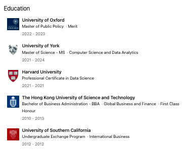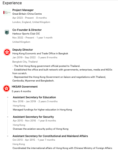 《追新聞》翻查Linkedin資料顯示,吳子豐已於今年以優良(Merit)成績獲得牛津大學公共行政碩士學位,2013年入職港府公務員系統,由2013年10月開始,曾在政制及內地事務局、保安局、教育局擔任助理秘書長,2019年調往香港駐曼谷經貿處出任副處長,直至2022年9月離任。今年4月開始,他在英國外交和聯邦事務部創立的「英中協會」(Great Britain-China Centre)擔任項目經理。