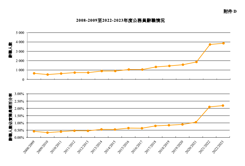 根據公務員事務局向立法會提交的文件顯示,政府於2021/22年度、2022/23年度分別流失 10,487、10,100名公務員,流失率為5.9%、5.7%,而2020/21年度流失率僅4.8%。公務員事務局局長楊何蓓茵解釋,2022/23年度流失的10,100名公務員,主因是「退休」,佔流失人數約58%,另有近4,000人辭職,辭職率逾2.2%。截至今年3月31日公務員編制約19.2萬個職位,填補了17.4萬個,仍有1.8萬個空缺,局長承認「情況不理想」。數據顯示,公務員退休人數約為5,800人,佔實際員額約3.3%,至於首長級公務員退休人數佔實際員額比率6.3至11.7%之間,2022/23年度為10.8%。她指出,政府1980年代曾擴大公務員編制,未來數年將迎來退休高峯期,估計退休率在10年後會降至2.7%。