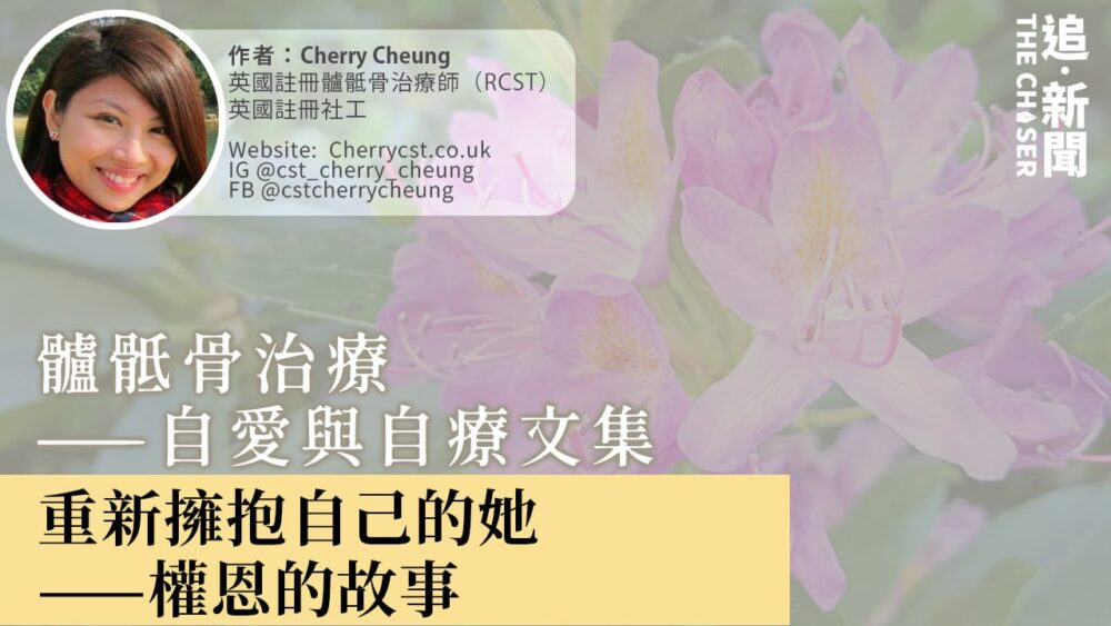 今次來找我做髗骶骨治療的案主是權恩,一位性格開朗、交遊廣闊、行俠仗義的女性。她一生做了很多善事,樂於助人。然而,到了應該可以安心歇下來、好好享受退休生活的年紀,卻被各種身體痛症纏繞:失眠、消化不良、便秘、情緒時而低落、時而高漲,八年間更先後經歷子宮癌和乳癌的折磨。