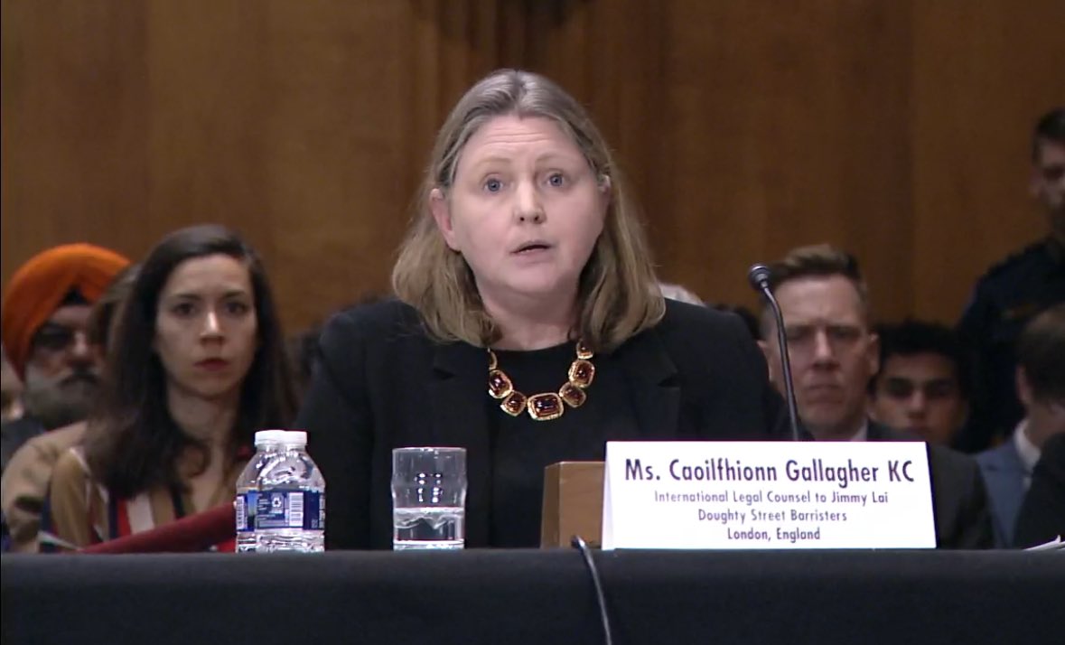 加拉格爾周三(6日)在美國華盛頓出席參議院外交關係委員會聽證會,講述專制政權的跨境迫害。加拉格爾表示黎智英被還柙前不久,其法律團隊以至黎崇恩便開始面對來自北京及香港的迫害,其中她在前赴參議院作證前的一個上午,已接獲17個關於強姦和死亡恐嚇的短訊,黎崇恩也被警告一旦回港便會遭起訴。