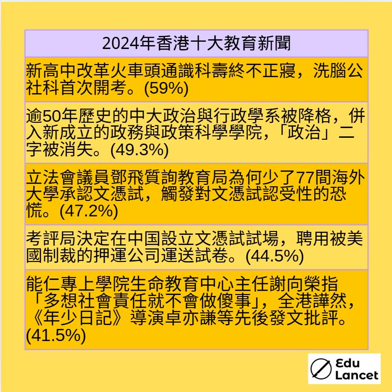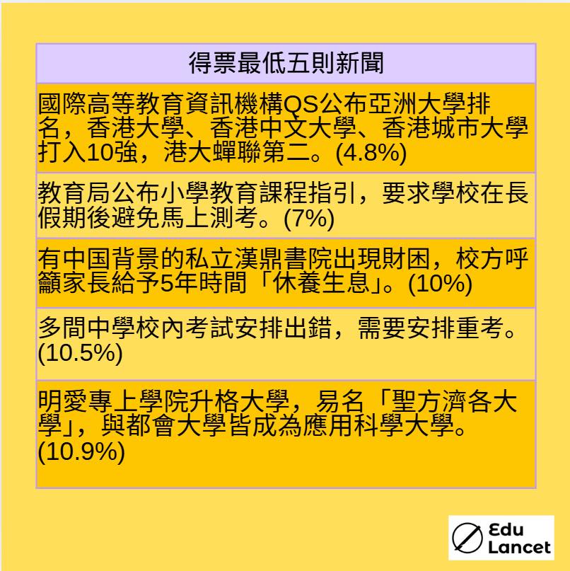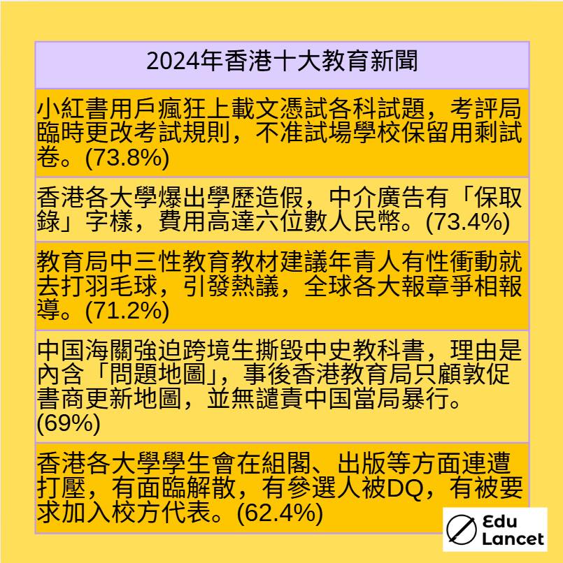 選舉有229人經網上投票,最多人選擇「小紅書用戶瘋狂上載文憑試各科試題」(73.8%),其次香港多間大學爆出學歷造假(71.2%),第三位為教育局中三性教育教材建議有性衝動就去打羽毛球。考評局歷史科評核發展部前經理楊穎宇接受《追新聞》訪問表示,在10大教育新聞之中,當中有9個結果與中共直接或間接有關。