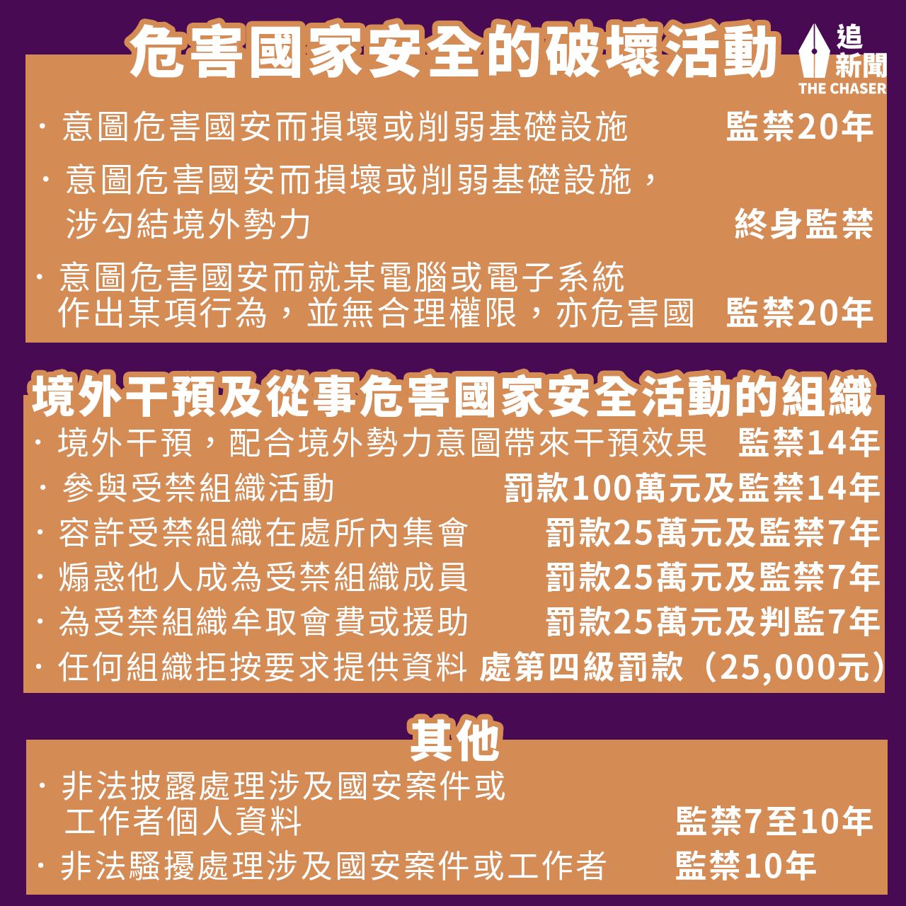 草案新增危害國家安全的「破壞活動」罪行,提出若有人意圖危害、或罔顧會否危害國安而損壞、削弱基礎設施,最高刑罰判監20年,若涉勾結境外勢力罪加一等,最重可判終身監禁。草案亦定義「公共基礎設施」包括中央或特區政府,或由其佔用的基礎設施、網絡或電腦或電子系統、辦公處所、軍事或國防的設施或設備、位於特區的公共交通工具或設施等。任何人若令有關設施變得容易損壞、無法發揮完整或部分應有功能等即屬違法,最高監禁20年。