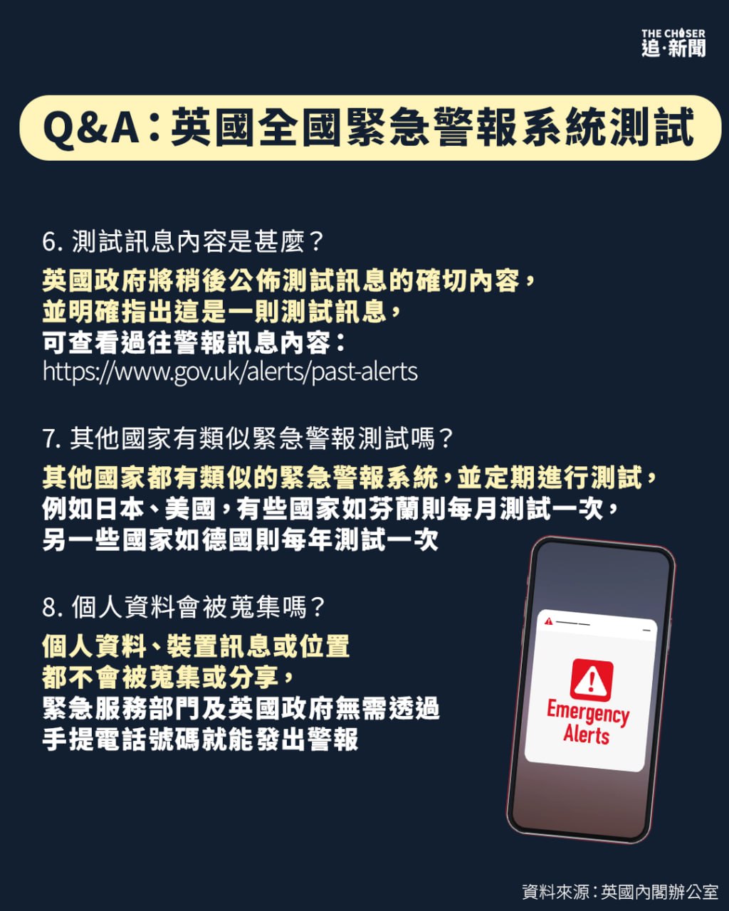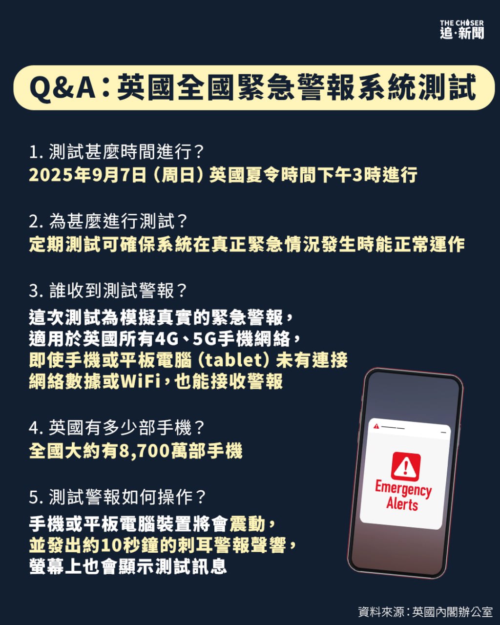 今年適逢倫敦七七爆炸案20年,英國周一(7日)舉辦多場紀念活動,內閣辦公室同日宣佈全國緊急警報測試將於9月7日下午3時進行,屆時預計8,700萬部手機、平板電腦、智能手錶同時響起警報,即使裝置設定「靜音」模式,在沒有數據網絡或WiFi的情況下,仍會發出震動並響起約10秒的刺耳警報,螢幕隨即彈出訊息,提醒只是測試,無需採取任何行動。