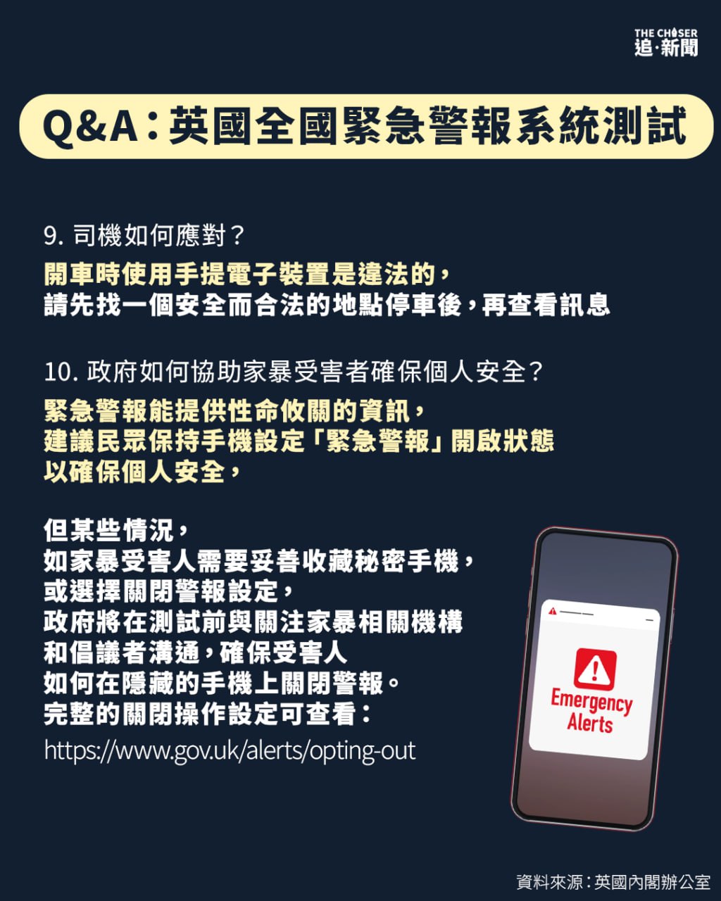 內閣辦公室發言人表示,9月7日的全國警報測試是為了確保系統運作正常,同時讓公眾熟悉警報;但有批評者認為,這類警報本身可能對民眾造成安全風險,例如駕駛者聽到刺耳警報聲突然分心,以及家暴受害人可能曝露其秘密手機。