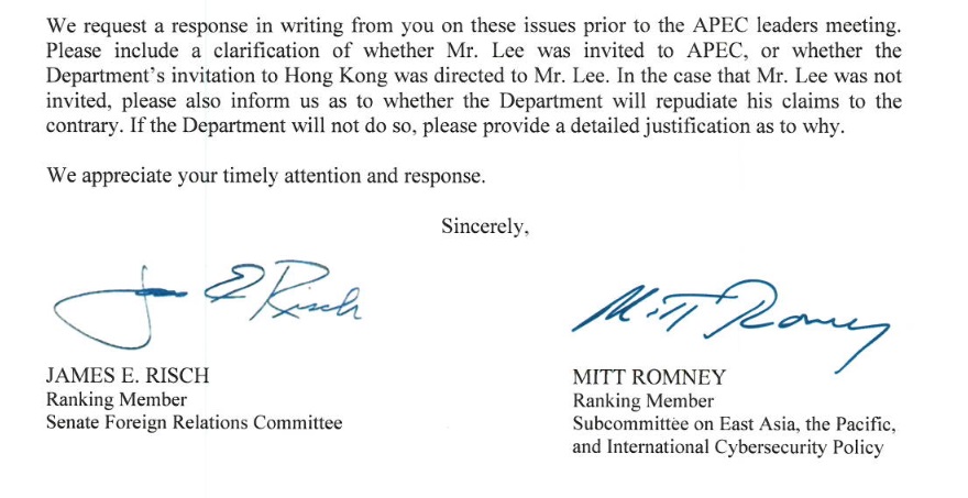 香港行政長官李家超早前聲稱獲邀出席APEC峯會,只因「日程問題」改由財政司司長陳茂波出席。美國參議院外交事務委員會副主席里施(Jim Risch)及猶他州聯邦參議員羅姆尼(Mitt Romney)共同去信國務卿布林肯,要求華府澄清是否曾邀請被制裁的李家超赴會,強調李家超破壞香港自治、侵犯人權,美國不應保護李家超。