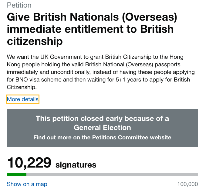 內政部回覆該份已達標的聯署時指出,英方仍然致力維繫BN(O)簽證途徑,令BN(O)護照持有人及其家庭成員能夠在英生活、學習和工作,但內政部無意更改法律來授予他們立即獲得英國公民資格的權利。