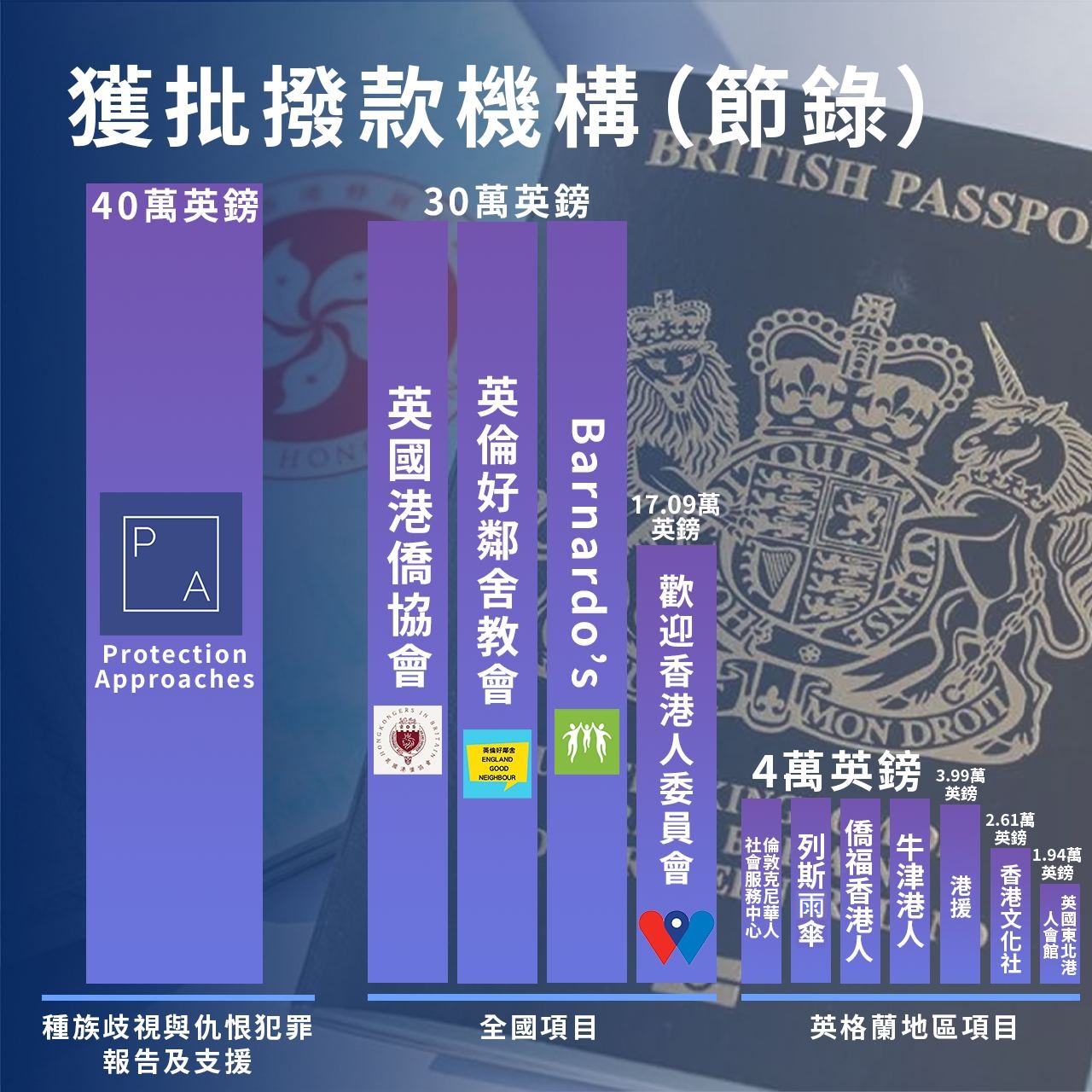 其他組織方面,英國政府向4個全國項目批出合共107萬英鎊(約1,069萬港元),受惠機構包括歷史悠久的英國慈善機構Barnardo’s,以及近年組成的英國港僑協會、英倫好鄰舍教會和「歡迎香港人委員會」。英倫好鄰舍教會對獲撥款表示榮幸,感謝眾人支持和付出,期望徵集更多港人意見以設計活動,「這恩遇還望各界守望鞭策,藉此保存香港人的初心」。