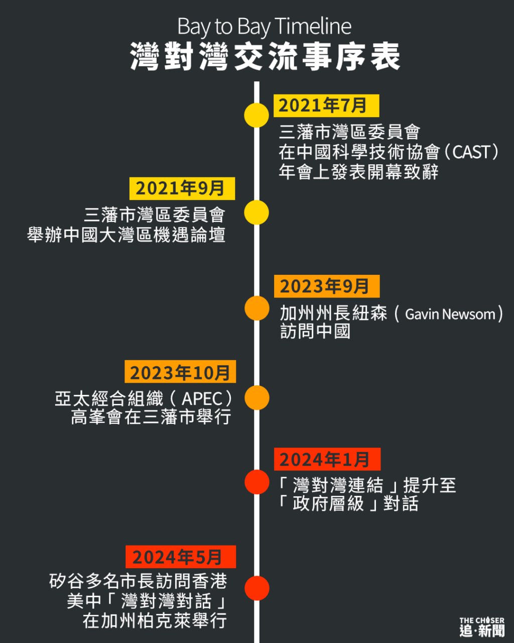 三藩市灣區委員會與香港推動建立緊密聯繫的行動可追溯至2019年11月。當時,中國政府剛發布一份宏大的珠三角整合總體規劃後,灣區委員會執行長應中共對外友協會長、中共前國家主席李先念的女兒李小林之邀前往香港,與當地政府、商界與學術界領袖分享三藩市——矽谷地區如何透過區域整合成功發展為全球第十九大經濟體與創新領導者的「秘訣」。