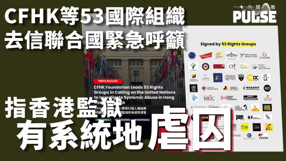 CFHK 周二(9月30日)在中共十一國慶前夕,聯署去信聯合國人權事務高級專員圖克作緊急呼籲,促請聯合國調查香港違反多項國際條約的情況。聯署信提到 CFHK 上月發表的調查報告披露香港監獄虐囚情況,報告引述多名政治犯的供詞,指獄中濫用單獨囚禁對付政治犯,超出國際公認的期限,甚至以送往精神病拘留作為恐嚇異見人士的武器。懲教人員又縱容系統性的身體、性與心理虐待,並長期忽視醫療需要,令在囚人士病情惡化甚至死亡;而且獄中衞生及設施都非常惡劣。