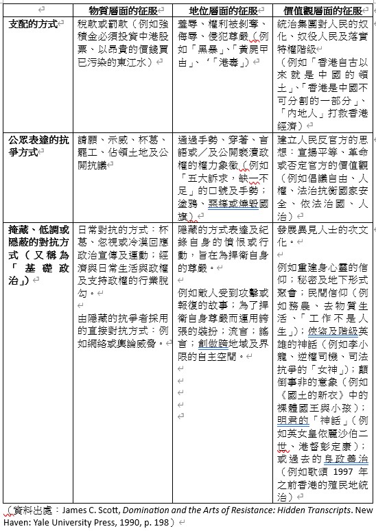 Scott在《征服與抵抗的藝術》一書中,以馬來西亞的一條農村作為他的研究案例,提出以下不同的方式及相應的策略;以下會根據實際的環境提出相關的詮釋及例子(見表)