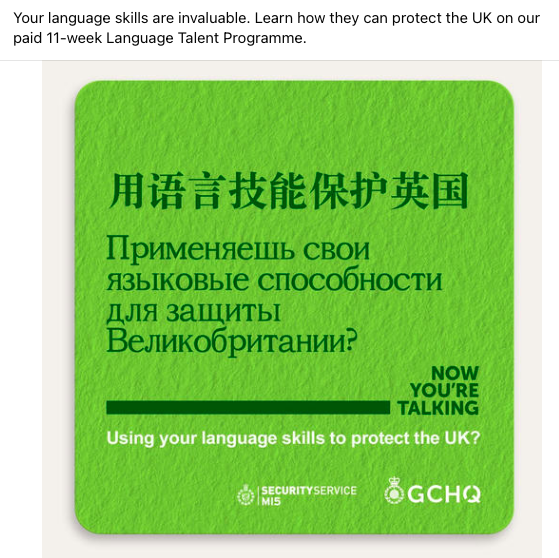 英國情報機關為期11周的「語言才能計劃」(Language Talent Programme),將於9月27日舉行為期1小時的簡介會(Insight Event),10月2日才正式公開招聘。根據招聘內容顯示,工作地點位於GCHQ總部Cheltenham、倫敦,以及曼徹斯特,按比例年薪為27,164至27,515鎊,入職要求列明大學本科最後一年主修普通話或俄語,或2020年或以後畢業獲得GPA 2:2或以上的成績,不論任何情況,情報機關需要具才能、適應能力強,以及投入工作的應徵者,最好他們經常使用語言技巧和願意學習新技能。